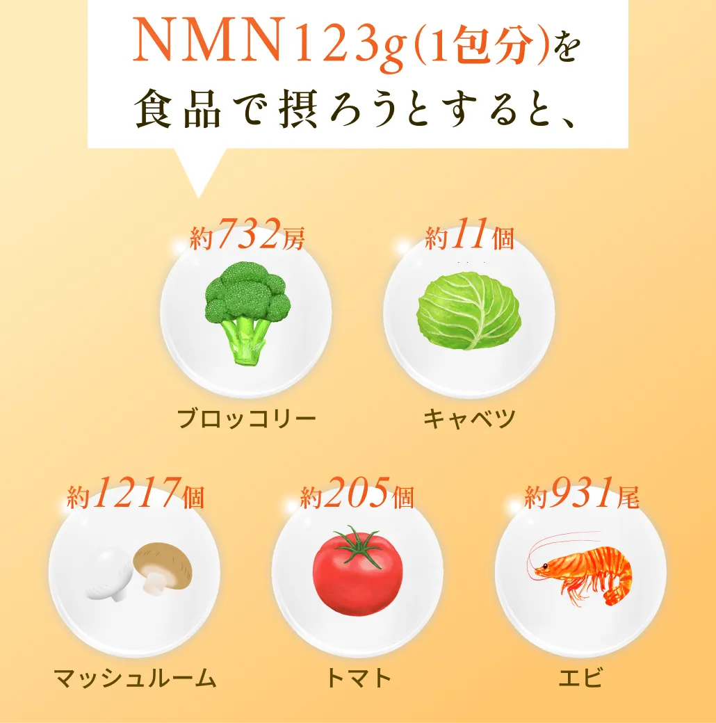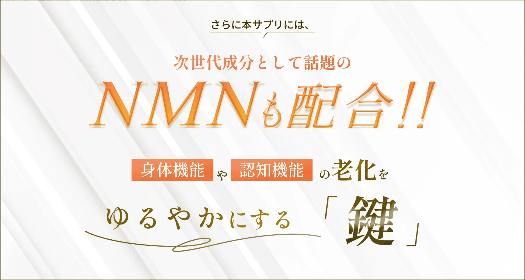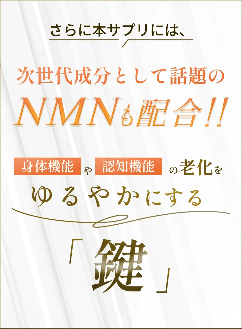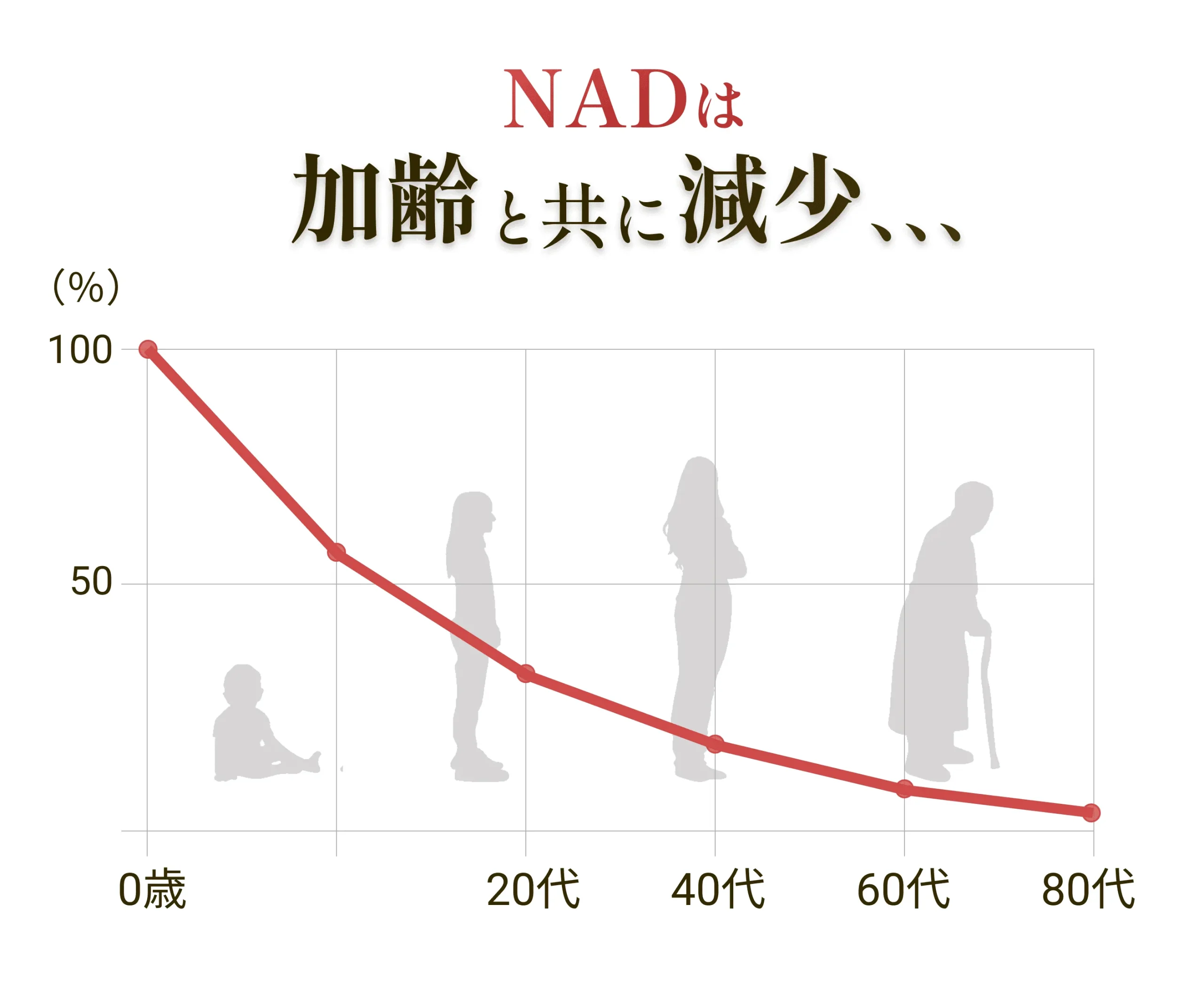 正式名称は「ニコチンアミド・モノ・ヌクレオチド」といい、 ヒトを含めあらゆる生物の体内で自然に生成されている物質のひとつです。 「NMN」は、体内に吸収されたのち「NAD」に変化します。「NAD」は人々の健康や、若々しさを維持する上で非常に重要な役割を果たしますが、残念ながら加齢と共に減少し、それに伴い生物は徐々に衰えていきます。